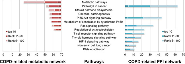 Figure 3: Some of COPD-related KEGG pathways significantly enriched by the top 100 genes in the COPD-related metabolic network (left) and the top 100 genes in the COPD-related PPI network (right). KEGG pathways (horizontal axis) were significantly enriched by the top 100 genes (the number in the vertical axis) using DAVID (Benjamini corrected P value < 0.05).