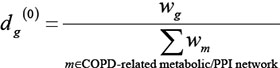 where w(h,g) is the interaction weight between interacting genes h and g , and neighbou(h) is the set of genes that interact with gene h. D(0) is the vector of initial disease risk scores for all genes. Each element of D(0), i.e. score dg(0) for gene g in each COPD-related network, was calculated as follows: