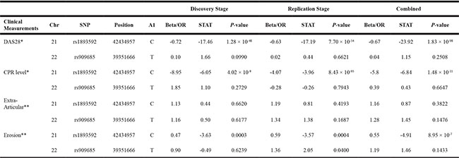 We chose four disease activity/severity-related measures of RA (DAS28, CRP level, extra-articular manifestations and bone erosion) for further analyses to investigate the potential effects of disease-susceptible SNPs and RA severity and activity. Linear regression models were fitted for quantitative measures (DAS28 and CRP level), and logistic regression models were used for qualitative measures (extra-articular and bone erosion). Gender, age, cohorts, and presence of RF and CCP were included in linear and logistic models as covariates to adjust the potential confounding effects.