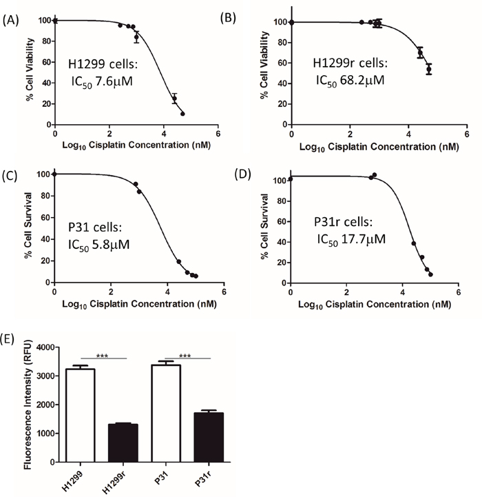 Figure 1: The effect of cisplatin on the viability of H1299, H1299r, P31 and P31r cells as determined by the Alamar Blue viability assay. Cells were seeded in 96 well plates at the following densities (A) H1299, 2,000 cells/ well; (B) H1299r, 6,000/cell/well; (C) P31, 2,000 cells/ well; (D) P31r, 6,000 cells/ well. All cells were treated with vehicle (0.9% NaCl) or varying concentrations of cisplatin (50 nmol/L -100 μmol/L) for 72 h. Alamar blue was added and cells were incubated in the dark for 5 h. The fluorescence was read at an excitation wavelength of 544 nm and an emission wavelength of 590 nm using a micro plate reader. Data expressed as % cell viability of vehicle treated controls. IC50 values represent the concentration of drug required to reduce viability by 50 %. Data are expressed as mean ± SEM from three separate experiments, performed in triplicate. (E) The growth rate of the H1299, H1299r, P31 and P31r cells was assessed over 72 h by seeding cells at 2,000 cells/well in a 96 well plate. After the elapsed time 20 μL of Alamar blue was added to the wells and the fluorescence was then measured by a spectrophotometer. Data is expressed as fluorescence intensity. Data are expressed as mean ± SEM from three separate experiments. Statistical analysis was carried out using the student t-test. *** = p<0.001.