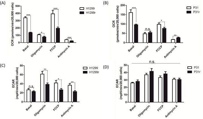 Figure 2: A comparative profile of whole cellular oxygen consumption rates and extracellular acidification rates for H1299, H1299r, P31 & P31r as determined by the Seahorse extracellular flux analyser. Cells were seeded at 20,000 cells/well and an assay was performed using the Seahorse extracellular flux analyser where oligomycin, FCCP and antimycin A were sequentially added to the wells during the run. (A) Whole cell basal oxygen consumption rates (OCR) of H1299 and H1299r and (B) P31 and P31r cells were determined as well as cellular OCRs after the inhibitors/uncoupler were added to the wells. (C) Whole cell extracellular acidification rate (ECAR) of H1299 and H1299r and (D) P31 and P31r cells was determined as well as ECAR after the inhibitors/uncoupler were added to the wells. Data are expressed as mean ± SEM for three separate experiments. Statistical analysis was carried out using the student t-test. *** = p< 0.001, ** = p<0.01, * = p<0.05.