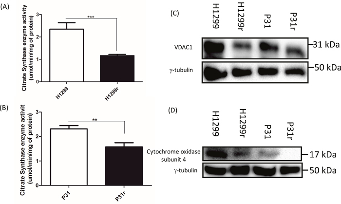 Figure 3: Comparative mitochondrial abundance as measured by citrate synthase activity, abundance of VDAC1 and cytochrome oxidase subunit 4. (A) Citrate synthase enzyme activity in the H1299 and H1299r cells. (B) Citrate synthase enzyme activity in the P31 and P31r cells. Data are expressed as mean ± SEM for three separate experiments. Statistical analysis was carried out using the student t-test. *** = p< 0.001, ** = p<0.01. For immunoblots, whole cell lysates were prepared from confluent cultures of H1299, H1299r, P31 and P31r cells. Proteins (90 μg) were resolved in 10% SDS-PAGE gels and transferred to a PVDF membrane. Blots were probed for either VDAC1, cytochrome c oxidase subunit 4 or the loading control γ-tubulin. (C) Representative blot of VDAC1 protein expression from three independent experiments. (D) Representative blot of cytochrome c oxidase subunit 4 protein expression from three independent experiments.