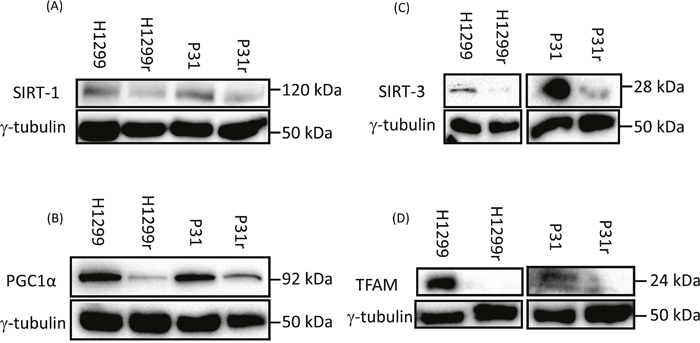 Figure 4: Expression of the mitochondrial biogenesis proteins: SIRT1, PGC1α, TFAM and SIRT3 in H1299, H1299r, P31 and P31r cell lysates as determined by immunoblot analysis. Whole cell lysates were prepared from confluent cultures of H1299, H1299r, P31 and P31r cells. Proteins (90 μg) were resolved in 10% SDS-PAGE gels and transferred to a PVDF membrane. Blots were probed for SIRT1, PGC1α, TFAM and SIRT3 or the loading control γ-tubulin. Figure shows representative blots of (A) of SIRT1, (B) PGC1α, (C) SIRT3, (D) TFAM protein expression; each from three independent experiments.
