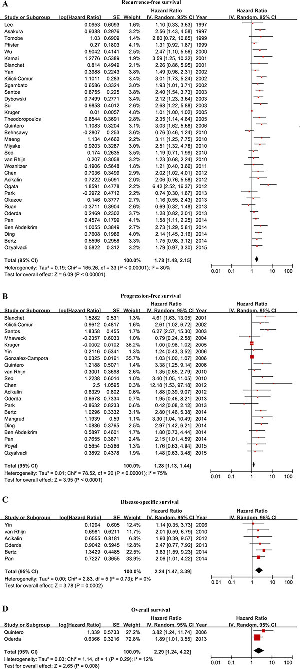 Figure 2: Begg tests for (A) recurrence-free survival and (B) progression-free survival confirmed the funnel plot symmetry and lack of evidence of publication bias. Fewer than 10 studies were included in meta-analyses of (C) disease-specific survival and (D) overall survival.