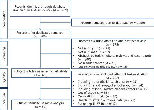 Embase, Scopus, and PubMed were searched for articles published in English to March 28, 2016 using the keywords “bladder cancer” and “Ki-67.” The titles and abstracts of the retrieved articles were reviewed independently by two authors (KK and CWJ) to minimize bias and to improve reliability. The reference lists of the retrieved articles were manually searched for potentially eligible studies that were not included in the initial database search. The full texts of the selected articles were independently screened by the same authors. Disagreements between the reviewers were resolved by consensus.