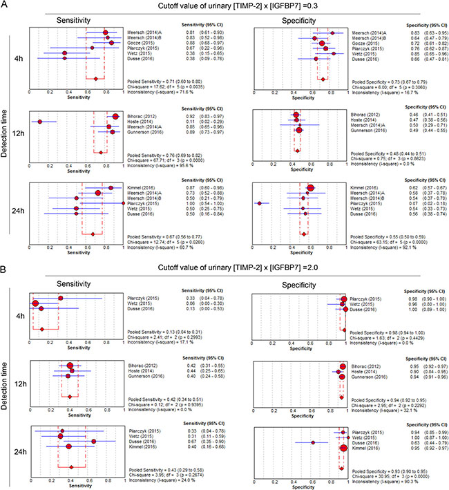 Figure 1: Forest plots of pooled sensitivities and specificities of urinary [TIMP-2] x [IGFBP7] for diagnosis of AKI at different cut off values and detection times. (A) When the cutoff value of urinary [TIMP-2] x [IGFBP7] was 0.3, the pooled sensitivities and specificities were calculated at 4 h, 12 h and 24 h, respectively. (B) When the cutoff value of urinary [TIMP-2] x [IGFBP7] was 2.0, the pooled sensitivities and specificities were calculated at 4 h, 12 h and 24 h, respectively.