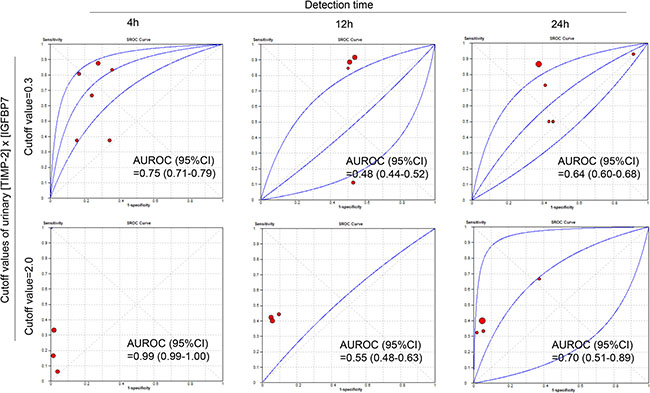 Figure 2: SROC curves of urinary [TIMP-2] x [IGFBP7] for diagnosis of AKI at different cut off values (0.3 or 2.0) and detection times (4 h, 12 h or 24 h).