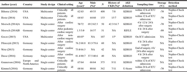 Abbreviations: AKI, acute kidney injury; TIMP-2, tissue inhibitor of metalloproteinase-2; IGFBP7, insulin-like growth factor binding protein 7; DOR, diagnostic odds ratio; AUROC, area under receiver operating characteristic curve; NA, not available. aCritically ill patients and patients after surgery were combined.