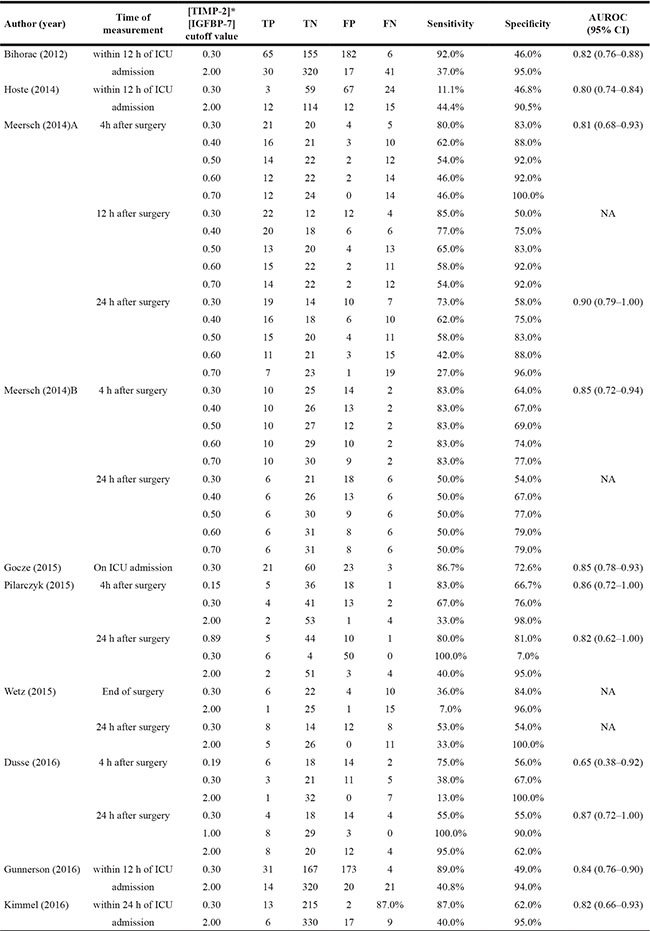 Abbreviations: TIMP-2, tissue inhibitor of metalloproteinase-2; IGFBP7, insulin-like growth factor binding protein 7; TP, true positive; TN, true negative; FP, false positive; FN, false negative; AUROC, area under receiver operating characteristic curve; ICU, intensive care units; NA, not available.