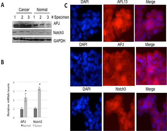 Figure 1: APL13, APJ, and Notch3 are overexpressed in human colon adenocarcinoma. (A) Western blot analysis of resected tissues from cancerous or adjacent normal tissues of colon adenocarcinoma. (B) RT-qPCR were used to assess mRNAs of APJ or Notch3 from these tissues (N = 3). (C) Immunofluorescence staining of LS180 colon carcinoma cell line with use of antibodies as indicated (N = 3). *P < 0.01.
