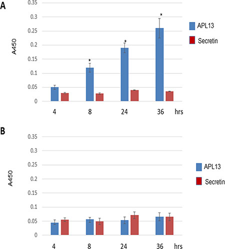The constitutive expression of APL13 in colon carcinoma suggests that APL can act on APJ in an autocrine manner, as previously described [20]. In order to test whether colon carcinoma can secrete APL13, we cultured LS180 cells in RPMI1640 and 10% FBS. The media were sampled at 4, 8, 24, or 36 h and subjected to ELISA assay. We also used secretin, a specific protein secreted from small intestines, as a negative control. As shown in Figure 2, APL13 was secreted by LS180 cells in a time-dependent manner. As expected, secretin was not detected in the media even after 36 h of culturing. HEK293 cells secreted no to minimal APL13 or secretin (Figure 2B). These data support that APL13 can stimulate APJ on the basis of autocrine loop.