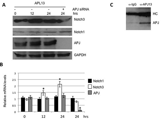 Figure 3: APL13 induces production of Notch3. Frozen LS180 cells were defrosted and cultured in RMPI1640 and 10% FBS for 24 h. The media was changed to fresh one, and the cells were treated with APL13 for the time period as indicated. The whole lysates were subjected to Western blot analysis (A) or extracted for isolation of total RNA, followed by RT-qPCR analysis (B). (C) Frozen LS180 cells were defrosted and cultured in RMPI1640 and 10% FBS for 24 h. The cells were lysed with RIPA buffer and immunoprecipitated with normal rabbit IgG (IgG) or anti-APL13 antibodies, as indicated. The immunoprecipitates were subjected to Western blot analysis using antibody to APJ. N = 3. *P < 0.01.