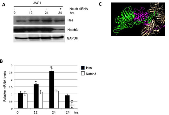 Figure 4: JAG1-Notch3 stimulates expression of Hes. Frozen LS180 cells were defrosted and cultured in RMPI1640 and 10% FBS for 24 h. The media was changed to fresh one and the cells were , treated with JAG1 for the time periods as indicated. The whole lysates were subjected to Western blot analysis (A) or extracted for isolation of total RNA, followed by RT-qPCR analysis (B). (C) Interaction of JAG1 (magnate and green) and was Notch3 predicted with use of protein-protein docking webserver as described in Material and Methods. N = 3. * P < 0.01.