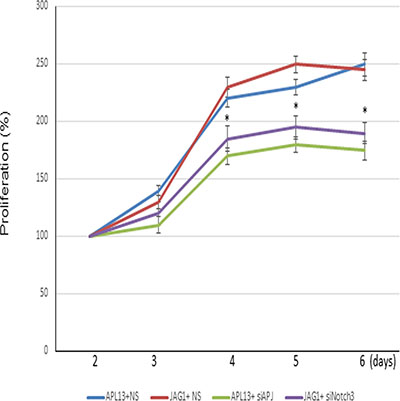 Figure 5: Inhibition of APJ or Notch3 reduces the LS180 cell proliferation. Proliferation curves of cells treated with control siRNA (NS) or siRNA to APJ (siAPJ) or Notch3 (siNotch3). * P < 0.01.