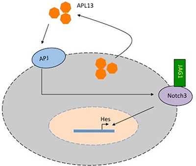 Figure 6: Model of APL13/APJ-Notch3 signaling in colon adenocarcinoma. APL13 can be secreted from colon carcinoma cells and act on APJ in an autocrine manner. Along with exogenous APL13, APL13/APJ system upregulates Notch3, allowing exogenous JAG1 to bind to it. Activated JAG1-Notch3 signaling activates Hes and other genes promoting the proliferation of colon carcinoma cells.