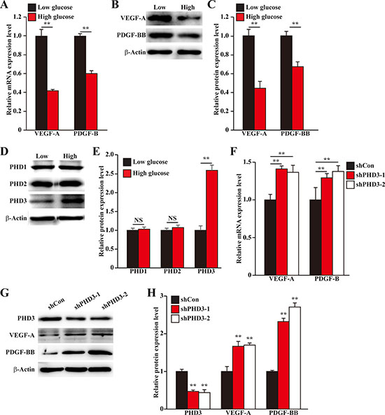 PHD family had been known as a crucial factor in regulating the expression of various angiogenic factors [19–21]. Thus, we next examined the effect of hyperglycemia on the expression levels of PHD family, i.e. PHD1, PHD2 and PHD3, in C2C12 cells. We found that while the protein expression levels of PHD1 and PHD2 were not significantly affected, hyperglycemia robustly induced PHD3 protein expression level (Figure 1D, 1E). To investigate the relationship between the hyperglycemia-induced PHD3 protein accumulation and the reduction of angiogenic factors expressions in skeletal muscle cells, we knocked down PHD3 expression using short hairpin RNA (shRNA) expression vectors. As shown in Supplementary Figure 1, both shRNA expression vectors targeting two different sites of PHD3, i.e., shPHD3-1 and shPHD3-2, could suppress the mRNA expression level of PHD3 for more than 60%. Silencing of PHD3 grossly elevated the mRNA expression levels of VEGF-A and PDGF-B under hyperglycemia (Figure 1F). Furthermore, the effect of PHD3-silencing on VEGF-A and PDGF-BB proteins showed similar tendency: PHD3-silencing stimulated VEGF-A and PDGF-BB protein expression levels under hyperglycemia (Figure 1G, 1H). Thus, hyperglycemia decreases the expression levels of angiogenic factors in skeletal muscle cells through, at least partly, the accumulation of PHD3 protein.