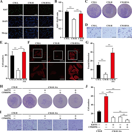 Figure 5: Salidroside promotes smooth muscle cells proliferation and migration potentials via skeletal cells secretome. (A, B) The proliferation of MOVAS cells cultured with indicated conditioned media, as analyzed by Ki67 staining: (A) representative images (scale bars: 200 μm); and (B) quantification of the ratio of Ki67 positive cells to DAPI positive cells. (C) The number of MOVAS cells cultured with indicated conditioned media, as analyzed by crystal violet. (D, E) The mobility of MOVAS cells cultured with indicated conditioned media was examined using transwell chamber assay: (D) representative images (scale bars: 100 μm); and (E) quantification of migrated cells. (F, G) Morphological changes of F-Actin, as examined by phalloidin staining: (F) representative images (scale bars: 100 μm for upper panels and 50 μm for lower panels), lower panels showed the enlarged images of the cropped part in the upper panels; (G) quantification analysis of fractal dimension. (H) The number of MOVAS cells cultured with CM-H/SA and indicated inhibitors, as analyzed by crystal violet staining. (I, J) The mobility of MOVAS cells cultured with CM-H/SA and indicated inhibitors, as examined by transwell chamber assay: (I) representative images (scale bars: 100 μm); and (J) quantification of migrated cells. All experiments were done under hypoxia. Data shown are representative from three independent experiments. Quantification data were expressed as mean ± S.D. (n = 6). **P < 0.01. CM-L: conditioned medium collected from C2C12 cells treated with PBS and cultured under low glucose condition; CM-H: conditioned medium collected from C2C12 cells treated with PBS and cultured under hyperglycemia; and CM-H/SA: conditioned medium collected from C2C12 cells treated with salidroside and cultured under hyperglycemia; Ki8751: VEGFR inhibitor; CP868596: PDGFR-B inhibitor.