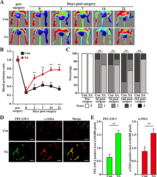 Figure 8: Salidroside promotes blood perfusion recovery by inducing neoangiogenesis in diabetic HLI model mice. (A) Representative of Laser Doppler Perfusion Images showing blood perfusion in the ischemic and non-ischemic hind limb of diabetic HLI model mice treated with PBS (upper panels) or salidroside (lower panels). (B) The blood perfusion ratio of ischemic hind limb to non-ischemic hind limb. Data were shown as mean ± S.D. (n = 7 per group). (C) Assessment test of the ischemic hind limb morphologies of diabetic HLI model mice treated by salidroside or PBS at indicated times (n = 7 per group, 0 = no difference from the non-ischemic hind limb, 1 = mild discoloration, 2 = moderate discoloration, 3 = severe discoloration, subcutaneous tissue loss, or necrosis, and 4 = amputation). (D, E) Immunohistochemistry against PECAM-1 (green) and α-SMA (red) in the gastrocnemius muscle of the ischemic hind limbs of diabetic HLI model mice treated by either salidroside or PBS at 21 days post-surgery: (D) representative images (scale bars: 100 μm); (E) quantification of PECAM-1 (left panel) and α-SMA positive (right panel) areas. Data shown are representative from three independent experiments. Quantification data were shown as mean ± S.D. (n = 6). **P < 0.01 (control versus salidroside-treated); Con: animals treated with PBS; SA: animals treated with salidroside.