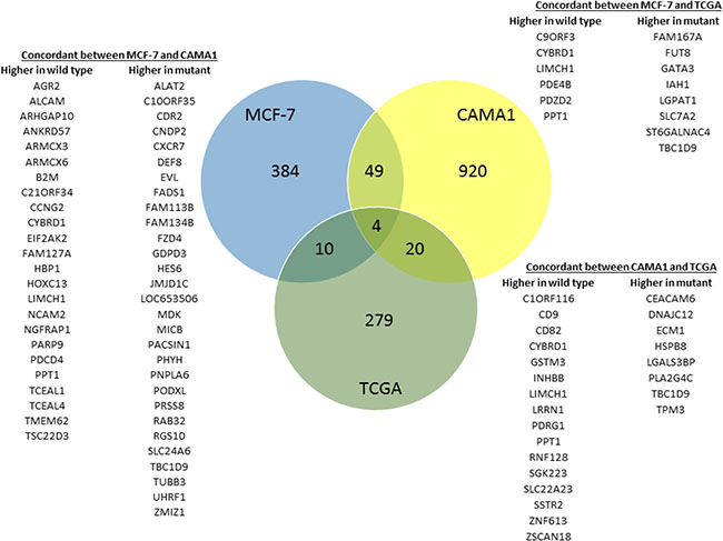 Figure 4: Differential gene expression related to GATA3 mutation. Venn diagram showing overlap in differentially expressed genes in the isogenic MCF-7 and CAMA1 cell line panels and 594 ER + breast cancers from the TCGA dataset. Overlap between gene lists from MCF-7, CAMA1, and TCGA are all greater than expected by chance and statistically significant by hypergeometric probability (P < 0.004 for MCF-7/TCGA, P < 0.007 for CAMA1/TCGA, and P < 7 × 10–11 for MCF-7/CAMA1).