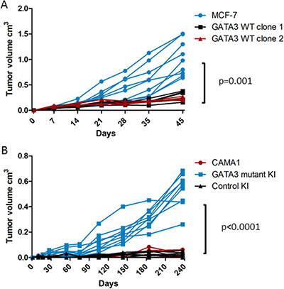 Figure 7: Xenograft growth of isogenic GATA3 mutant and wild type breast cancer cell lines. (A) Nude mouse xenograft growth of MCF-7 (n = 9) and GATA3 wild type derivative clones (n = 5 each). P value for repeated measures two-way ANOVA is shown. (B) NSG mouse xenograft growth of CAMA1, GATA3 mutant knock-in, and control knock-in cells (n = 10 mice per group). P value for repeated measures two-way ANOVA is shown.