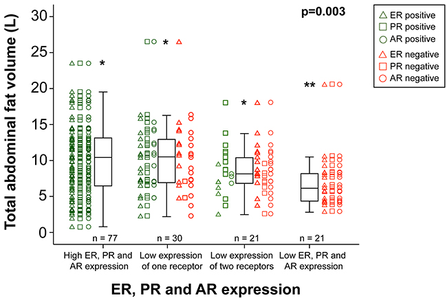 To our knowledge, this is the first study presenting data on the relation between hormone receptor status in EC and CT-derived preoperative obesity markers. Interestingly, all the CT-estimated obesity markers except VAV% were associated with PR and AR positivity; both markers reportedly associated with less aggressive tumors [25, 26]. Furthermore, we observed a progressive loss of hormone receptor expression with decreasing total body fat (Figure 2), a trend that seems predominantly driven by PR loss. The present findings are in line with our previous report linking obesity to endometrioid histology and positive PR status [27]. Surprisingly, no significant association was observed between ERα status and obesity estimates, in spite of the fact that increased estrogen signaling is a well-established putative pathogenic mechanism in EC development in obese patients. This lack of association with ERα could be related to transcriptionally repressive effects on ERα mediated by PR signaling. In breast cancer cells, increased level of the PR B isoform has been reported to repress both ERα protein expression and mRNA levels [28] which is in line with our finding, but further studies are needed to understand the interplay between hormone receptor signaling in the setting of obesity in EC.