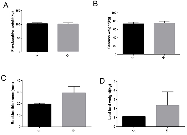 Figure 1: Phenotype information related to fat deposition of Yimeng black pigs with extreme backfat thickness. (A) Pre-slaughter weight. (B) Carcass weight. (C) Backfat thickness. (D) Leaf lard weight. H, Yimeng black pig group with higher backfat thickness; L, Yimeng black pig group with lower backfat thickness.