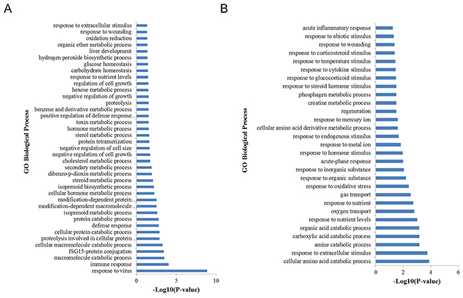 Figure 3: GO biological process analysis of DEGs. (A) GO biological process analysis of upregulated DEGs. (B) GO biological process analysis of down-regulated DEGs when comparing H to L groups.