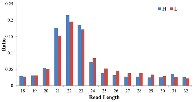 Figure 4: The length distribution of clean reads in the sRNA-seq libraries of H and L groups.