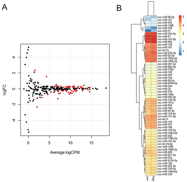 Figure 5: Identification of DEGs between H and L groups. (A) Expression scatter plot of differentially expressed miRNAs (represented in red) with FDR P-value ≤ 0.05. X-axis values are average log2 (counts per million) and y-axis values are log2 (fold change). (B) Heatmap and hierarchical clustering of DE miRNAs.
