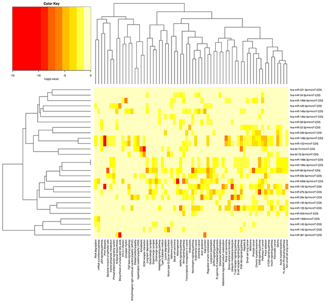 A total of 58 known miRNAs were differentially expressed with a criterion of an FDR-value less than 0.05. Of these, 26 were upregulated and 32 were down-regulated in the H group relative to the L group. The differential expression of the 58 miRNAs in the H and L groups are presented in Figure 5. KEGG pathway analysis was performed to better understand the function of the DE miRNAs, and DIANA mirPath indicated these DE miRNAs were significantly enriched in the PI3K-Akt signaling pathway (p = 1.95E-36), the Wnt signaling pathway (p = 3.79E-35), and axon guidance (p = 3.44E-33). To further classify and predict the function of the DE miRNAs, we performed hierarchical clustering of the DE miRNAs and their target pathways (Figure 6). Some miRNAs, which were involved in similar regulation patterns or pathway functions, were clustered together, such as miR-148b-3p and miR-152.