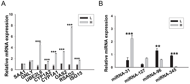 Figure 8: RT-qPCR validation of the DEGs and DE miRNAs. (A) 8 DEGs were validated by RT-qPCR. (B) 4 DE miRNAs were validated by RT-qPCR. Porcine β-actin and U6 were selected as internal controls for mRNA and miRNA, respectively. This experiment was repeated three times. Data are shown as means ± S.E.M; **P < 0.01 and ***P < 0.001.
