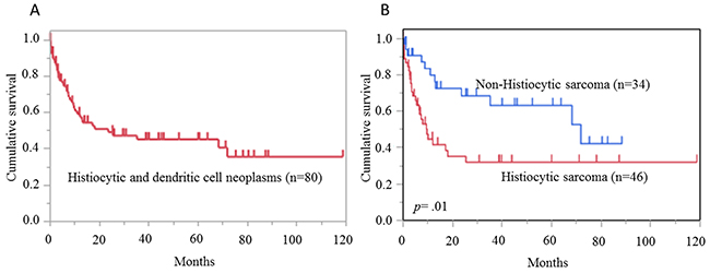 Survival curves of overall survival (OS) were calculated by the Kaplan–Meier method. The end-points of OS were defined as the time of death due to histiocytic and dendritic neoplasms. A log-rank test was used to compare survival curves. Univariate and multivariate analyses were performed to evaluate the influence of prognostic factors on the OS by the Cox proportional hazards models. The statistical analyses were carried out in JMP, version 10 (SAS institute, Tokyo, Japan). P-values < 0.05 indicated statistical significance.
