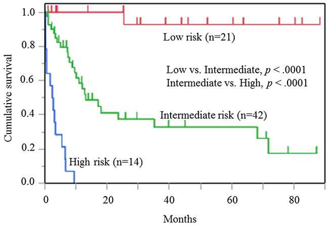 Twenty-one cases were in the low risk group (27.3%; median survival: NA months); 42 cases were in the intermediate risk group (54.5%; median survival, 13.1 months; 95% CI 9.60-35.17 months); and 14 cases were in the high risk group (18.1 %; median survival, 2.52 months; 95% CI 0.27-5.43 months). The score allowed stratification of patient prognoses (low risk group vs. intermediate risk group, p <.0001; intermediate risk group vs. high risk group, p <.0001).