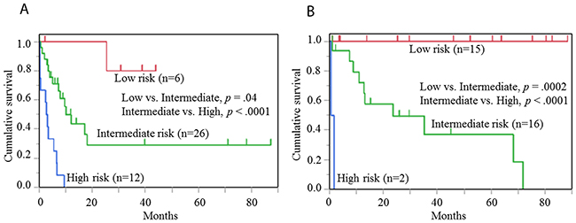 Figure 4: Risk classification of cases with histiocytic and non-histiocytic sarcomas. (A) Classification of 44 cases with histiocytic sarcoma into 3 risk groups. There are significant differences between groups next to each other: Low risk group vs. Intermediate risk group, p =.04; Intermediate risk group vs. High risk group, p <.0001. (B) Classification of 36 cases with non-histiocytic sarcoma into 3 risk groups. There are significant differences between groups next to each other: Low risk group vs. Intermediate risk group, p =.0002; Intermediate risk group vs. High risk group, p <.0001.