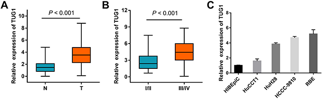 The expression of TUG1 was determined by qRT-PCR in paired ICC and normal tissue samples from 102 patients. As shown in Figure 1A, TUG1 was overexpressed in ICC compared to corresponding non-tumor tissues (3.68 ± 0.2 vs 1.54 ± 0.1, P < 0.001). We next analyzed the relationship between TUG1 expression and clinical features of ICC. High TUG1 expression was significantly associated with tumor stage (P < 0.001, Figure 1B), intrahepatic metastasis (P = 0.001), lymph node metastasis (P < 0.001), and perineural invasion (P = 0.029). There was no association between TUG1 expression and age, sex, tumor size, CA199, differentiation, hepatitis B/C infection, or venous invasion (Supplementary Table 1). TUG1 was also highly expressed in ICC cell lines compared to normal biliary epithelium cell (HIBEpiC) (Figure 1C).
