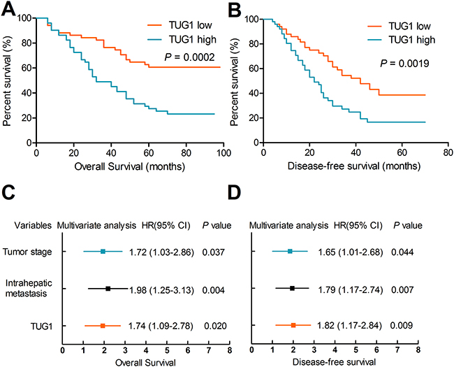 Figure 2: Upregulation of TUG1 is associated with poor prognosis. Patients with high TUG1 expression had poorer overall survival (A) and poorer disease-free survival rates (B) than patients with low TUG1 expression. (C-D) TUG1 expression, tumor stage and intrahepatic metastasis were independent prognostic indicators for both OS and DFS.