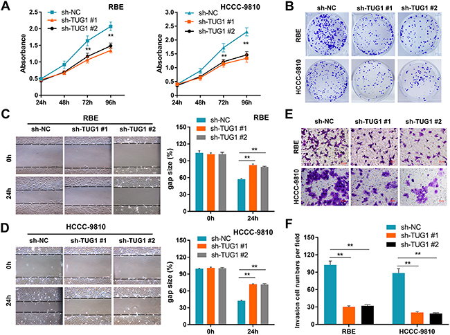 Figure 3: TUG1 knockdown impairs ICC cell proliferation and motility. Effects of TUG1 knockdown on cell proliferation (A), colony formation (B), migration (C-D), and invasion (E-F) in ICC cells. Data are presented as mean ± SD based on three independent experiments. **P < 0.01 compared to control (Student’s t-test).