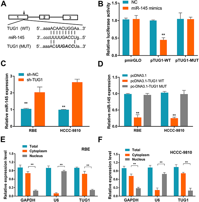 Figure 5: Identification of miR-145 as a target of TUG1. (A) Putative binding sites of miR-145 in TUG1 sequence, identified using starBase v2.0. (B) Luciferase activity in cells co-transfected with miR-145 mimics and luciferase reporters containing TUG1 or mutant transcripts. Data are presented as the relative ratio of firefly/Renilla luciferase activity. Results shown are from three independent experiments. (C) Effect of TUG1 knockdown on the expression of miR-145 in ICC cells. (D) Effect of TUG1 overexpression on the expression of miR-145 in ICC cells. (E-F) TUG1 localization (%) in the cytoplasmic and nuclear fractions of ICC cells. GAPDH and U6 served as cytoplasmic and nuclear localization markers, respectively. Data are presented as the mean ± SD of triplicate experiments. **P < 0.01 compared to control (Student’s t-test).
