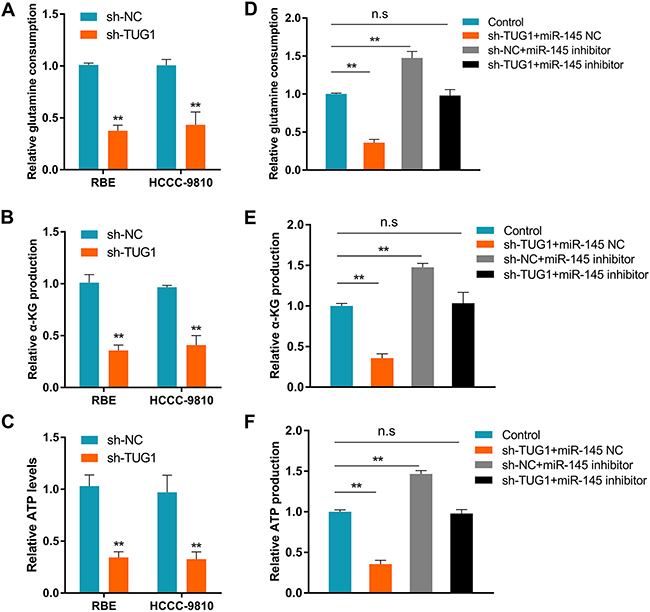 Figure 6: TUG1 increases glutamine metabolism in ICC by sponging miR-145. (A) Glutamine consumption, (B) α-KG production, and (C) cellular ATP levels in ICC cancer cells after TUG1 knockdown. (D) Glutamine consumption, (E) α-KG production, and (F) cellular ATP levels in ICC cancer cells transfected with sh-TUG1+miR-145 NC, sh-NC+miR-145 inhibitor, sh-TUG1+miR-145 inhibitor, and in control cells. Data are presented as the mean ± SD based on three independent experiments. **P < 0.01 compared to control (Student’s t-test).