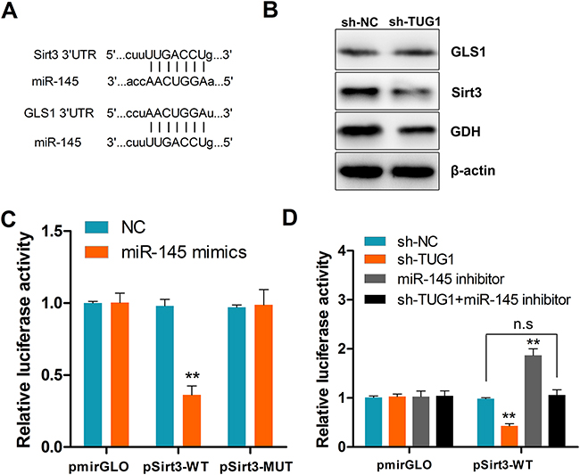 Figure 7: TUG1 upregulates Sirt3 and GDH expression by sequestering miR-145. (A) Schematic depiction of a miR-145 seed match in the 3’-UTR ofSirt3 and GLS1 mRNAs as identified by TargetScan. (B) Western blot assessment of Sirt3, GLS1, and GDH protein expression in shTUG1-transfected cells. GAPDH served as a loading control. (C) Luciferase activity in cells co-transfected with NC or miR-145 mimics, and luciferase reporters containing Sirt3 or mutant transcripts. (D) Luciferase activity in cells co-transfected with NC, sh-TUG1, miR-145 inhibitor, sh-TUG1+miR-145 inhibitor, and luciferase reporters containing Sirt3 or no specific promoter. Data are presented as mean ± SD based on three independent experiments. **P < 0.01 compared to control (Student’s t-test); n.s, not significant.