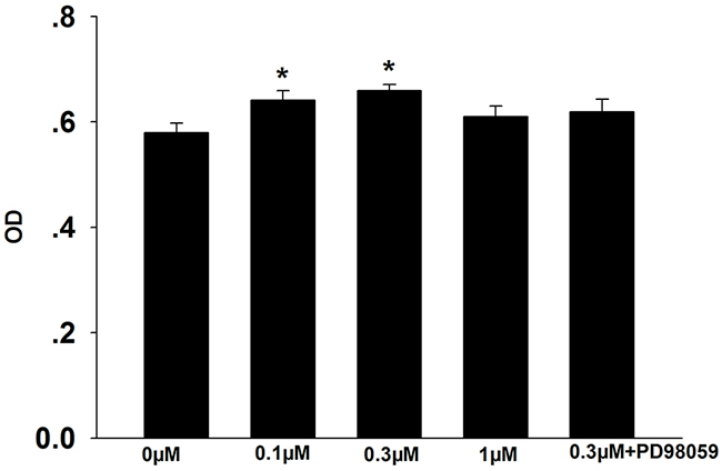 Figure 1: Effects of formononetin on CNE2 cell proliferation. The number of CNE2 cell was significantly increased in 0.1 μM and 0.3 μM formononetin group but not in the group pretreated with PD98059. OD, optical density. * = P < 0.05 vs control; n=7.