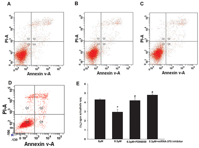 Figure 2: Effects of formononetin on the late apoptosis of CNE2 cells. the late apoptosis of CNE2 cells were inhibited by 0.3 μM formononetin. When CNE2 cells were pretreated with PD98059, the rate of late apoptosis was similar with the control. (A) control group; (B) 0.3 μM formononetin group; (C) 0.3 μM formononetin group+PD98059; (D) 0.3 μM formononetin group+ miR-375 inhibitor and (E) rate of late apoptosis in CNE2 cells. *=P < 0.05 vs control; n=3. #=P < 0.05 vs 0.3 μM formononetin group; n=3.
