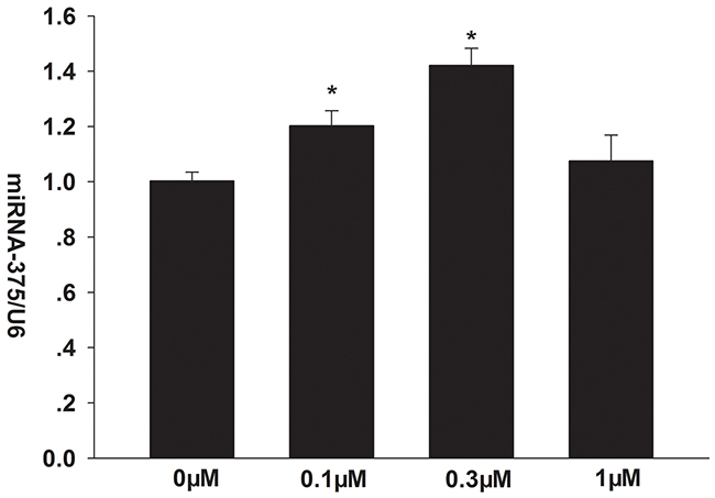 Figure 3: Effects of formononetin on the mRNA expression of miR-375 in CNE2 cells. miR-375 mRNA expression was significantly upregulated by 0.1 and 0.3 μM formononetin. * = P < 0.05 vs control; n = 3.