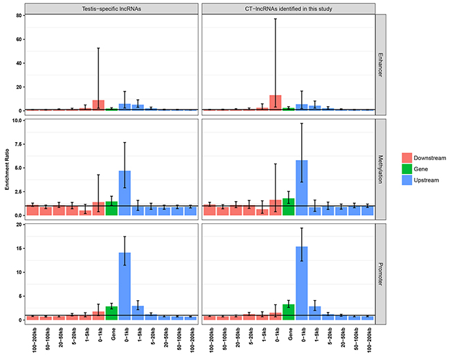 As our previous work indicated that testis-specific regulatory elements (promoters, non-coding RNAs and methylation sites) might be potential regulators of testis-specific genes and CT genes, we further explored the correlation between testis-specific regulatory elements and the expression patterns of TS-lncRNAs/CT-lncRNAs. We found that testis-specific promoters were frequently located upstream (-100 bp to 5 kb) of TS-lncRNAs/CT-lncRNAs, while testis-specific methylation sites were more likely to be located more proximally upstream (-100 bp to 1 kb) (Figure 4). Unlike testis-specific genes/CT genes, we observed a significant enrichment of testis-specific enhancers 20 kb upstream and 5 kb downstream of TS-lncRNAs/CT-lncRNAs (Figure 4), indicating that adjacent enhancers might be another regulatory mechanism for the activation of TS-lncRNAs/CT-lncRNAs.