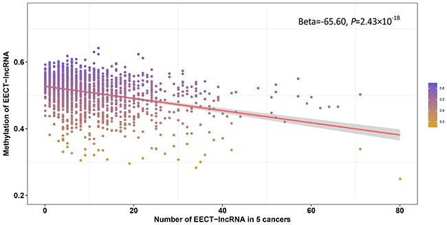 In addition to testis-specific enhancers, we attempted to explore other regulatory mechanisms of EECT-lncRNA activation in cancer. We integrated DNA methylation and expression data to investigate the relationship between the number of activated EECT-lncRNAs and the methylation level of their promoters. Five cancer types were included in the analysis, with more than 100 platform-overlapped samples available. A significantly negative association between the average methylation level of all EECT-lncRNA promoters and the number of activated EECT-lncRNAs in each sample was observed, after adjustment for cancer type (Beta=-65.60, P=2.43×10−18) (Figure 5). The negative association remained (Beta=-83.03, P=2.16×10−15) after we included the methylation level of all gene promoters, suggesting that EECT-lncRNAs might be activated by promoter hypo-methylation.