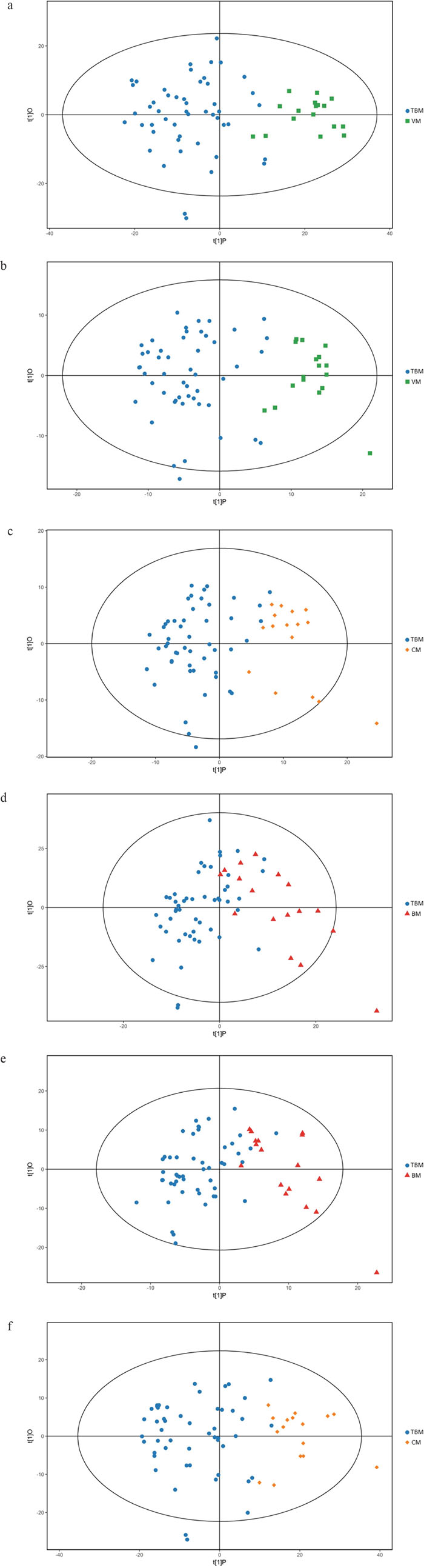 Figure 2: Orthogonal projections to latent structures-discriminate analysis (OPLS-DA) score plots for comparisons between. (a) Tuberculous meningitis (TBM) and viral meningitis (VM) in positive electrospray ionization (ESI) mode; (b) TBM and VM in negative ESI mode; (c) TBM and bacterial meningitis (BM) in positive ESI mode. (d) TBM and BM in negative ESI mode; (e) TBM and cryptococcal meningitis (CM) in positive ESI mode; (f) TBM and CM in negative ESI mode. OPLS-DA showed clear discrimination between TBM and viral meningitis, bacterial meningitis, cryptococcal meningitis.