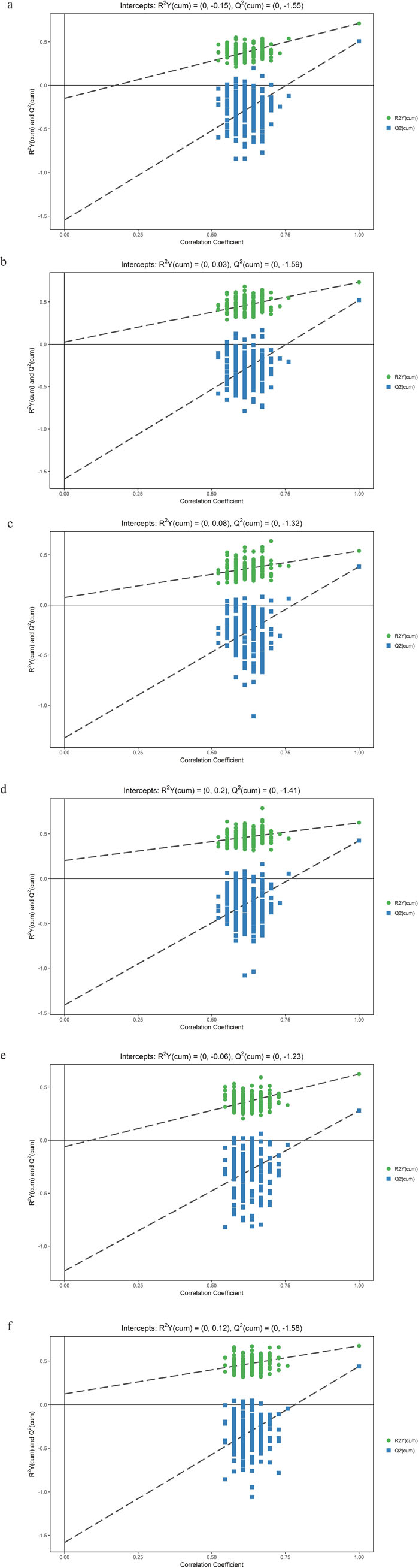 R2X and R2Y are the cumulative modeled variation in X and Y matrix, respectively. Q2 is the cumulative predicted variation in Y matrix.