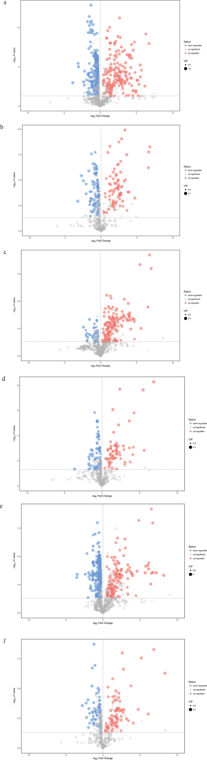 Figure 4: Volcano plots of differentially expressed compounds for each comparison. Red spots indicated up-regulated metabolites in TBM, while blue spots demonstrated down-regulated metabolites. Grey spots showed no significant difference in the comparison. The spot size represented the value of variable importance in the projection (VIP). The horizontal axis was related to the value of fold change (FC), while the vertical axis was associated with P value. (a) Tuberculous meningitis (TBM) versus viral meningitis (VM) in positive electrospray ionization (ESI) mode; (b) TBM versus VM in negative ESI mode; (c) TBM versus bacterial meningitis (BM) in positive ESI mode. (d) TBM versus BM in negative ESI mode; (e) TBM versus cryptococcal meningitis (CM) in positive ESI mode; (f) TBM versus CM in negative ESI mode.