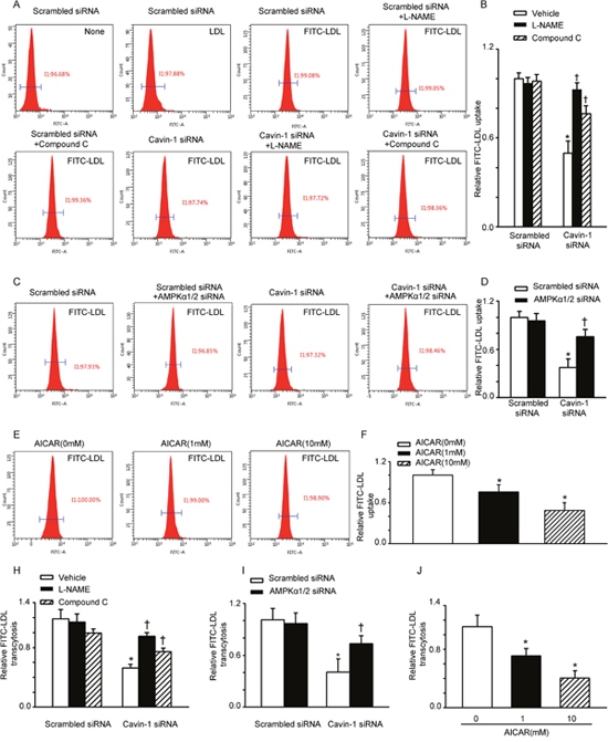 Figure 1: Cavin-1 siRNA suppressed LDL uptake and LDL transcytosis in HUVECs. (A, B) Cells were transfected with scrambled siRNA or cavin-1 siRNA (20 nM) for 48 h, then incubated with L-NAME (50 μM) or Compound C (1 μM ) for 48 h. (C, D) Cells were transfected with scrambled siRNA (20 nM) or cavin-1 siRNA (20 nM) for 3 h, then co-transfected with scrambled siRNA (10 nM) or AMPKα1/2 siRNA (10 nM) for 45 h. (E-F) Cells were treated with indicated concentration of AICAR. (A, C, E) Flow cytometry images of FITC-LDL uptake in HUVECs incubated with FITC-LDL. (B, D, F) Summary bar graph showing the mean FITC-LDL fluorescent intensity in each group. (H, I, J) Quantitative summary of FITC-LDL transcytosis in HUVECs. * P <0.05 vs. scrambled siRNA or AICAR (0 mM); † P <0.05 vs. cavin-1 siRNA, n=4.