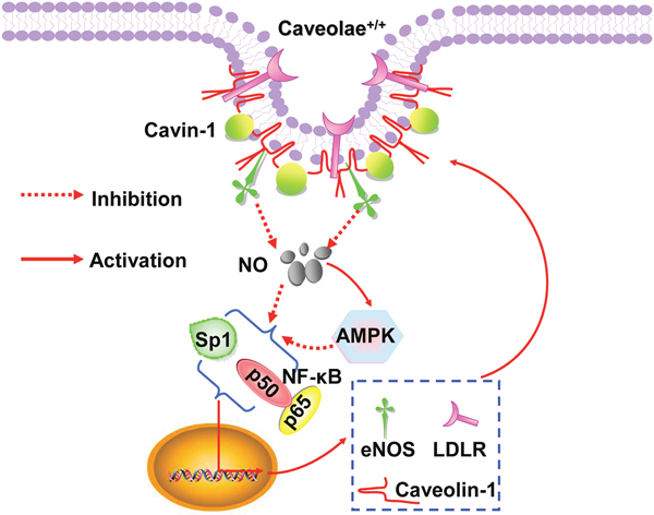 Expression of cavin-1 and caveolin-1 are closely linked [14, 16, 18, 23, 41]. The loss of fine balance is expected to result in impaired caveolae and dysfunction of caveolae-related signaling, e.g. LDL transcytosis and eNOS. In present study, we first demonstrated that cavin-1 is essential for caveolae-mediated LDL transcytosis in endothelial cells, and cavin-1 knockdown increased eNOS activity and NO production. Reacting to the increased NO, the activity of NF-κB/Sp1 is inhibited by NO or AMPK, consequently suppressed expression of caveolae-residing proteins such as LDLR, caveolin-1 and eNOS.